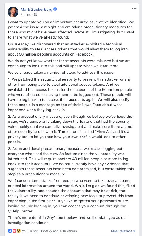 गएको बिहिबार फेसबुकको सुरक्षा प्रणाली तोडेर ह्याकर हरुले धेरै प्रयोग कर्ता हरुको पासवर्ड चोरि गरेका छन् । उनीहरुले फेसबुकको टोकन चोरी गरि सजिलै प्रयोगकर्ता को जानकारी हासिल गरेका हुन् ।